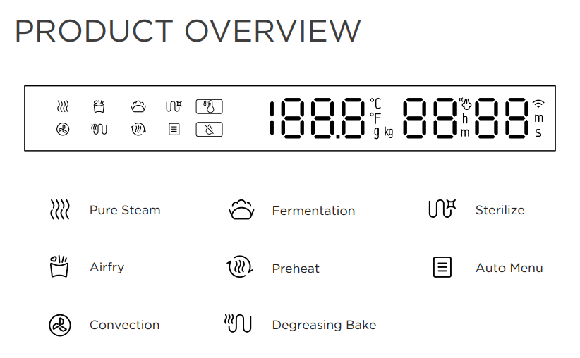 Other Features: Smart WiFi Control, Healthy Steam Cooking, Crunchy Air Fry, Crispy Grill, Pure Steam, Convection, Sterilize