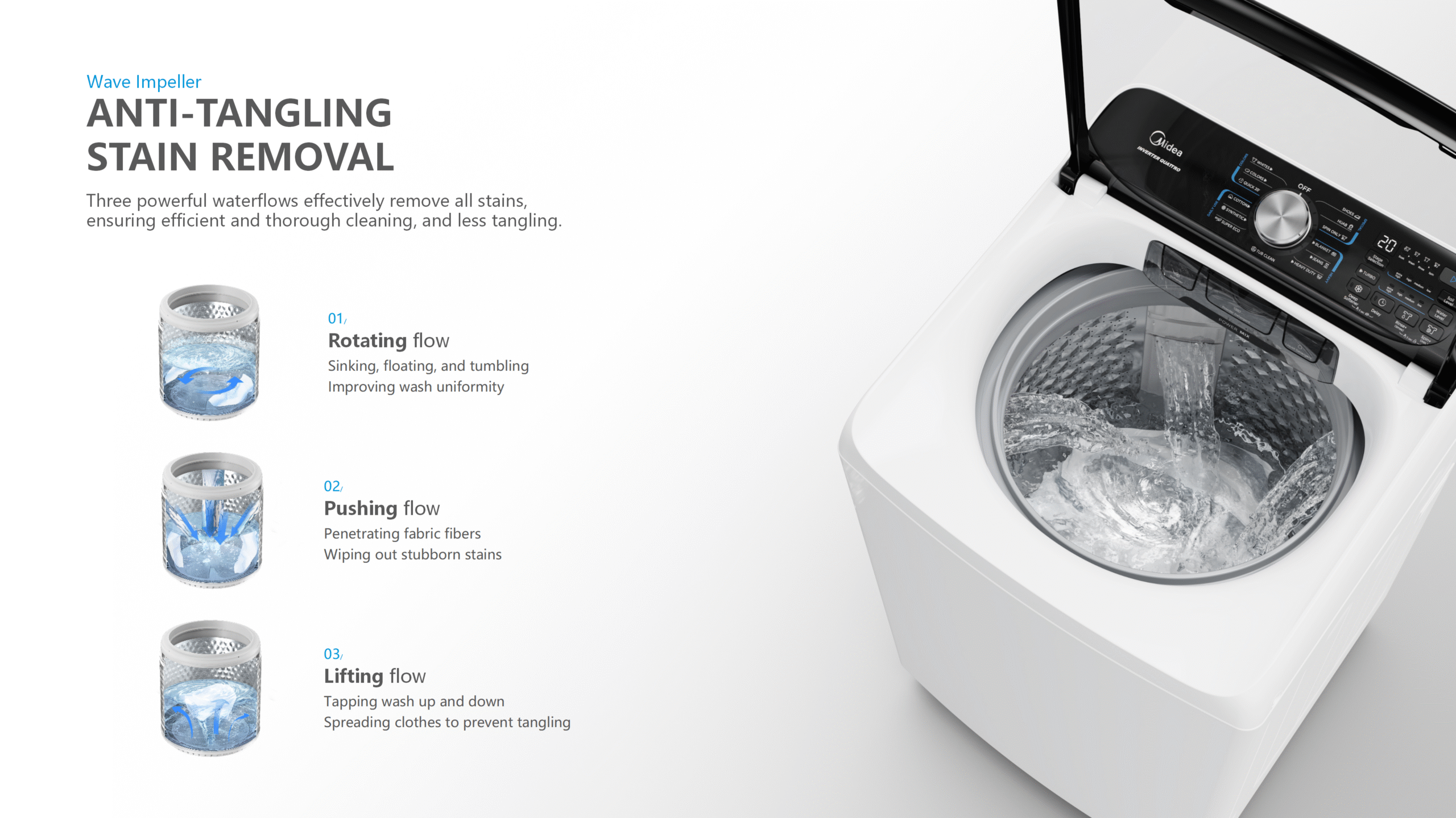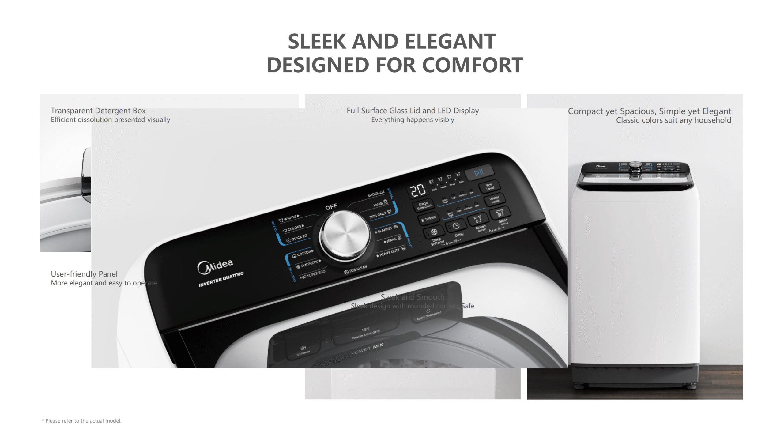 Programs: 9 – Whites, Normal, Quick 20’, Cotton, Synthetic, Super Eco, Delicates, Towels, Spin Only, Duvet, Jeans, Heavy Duty