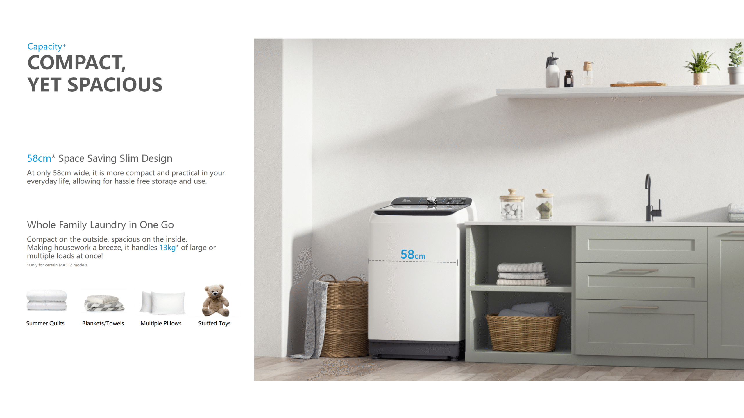 • Programs: Whites, Normal, Quick 20’, Cotton, Synthetic, Super Eco, Delicates, Towels, Spin Only, Duvet, Jeans, Heavy Duty