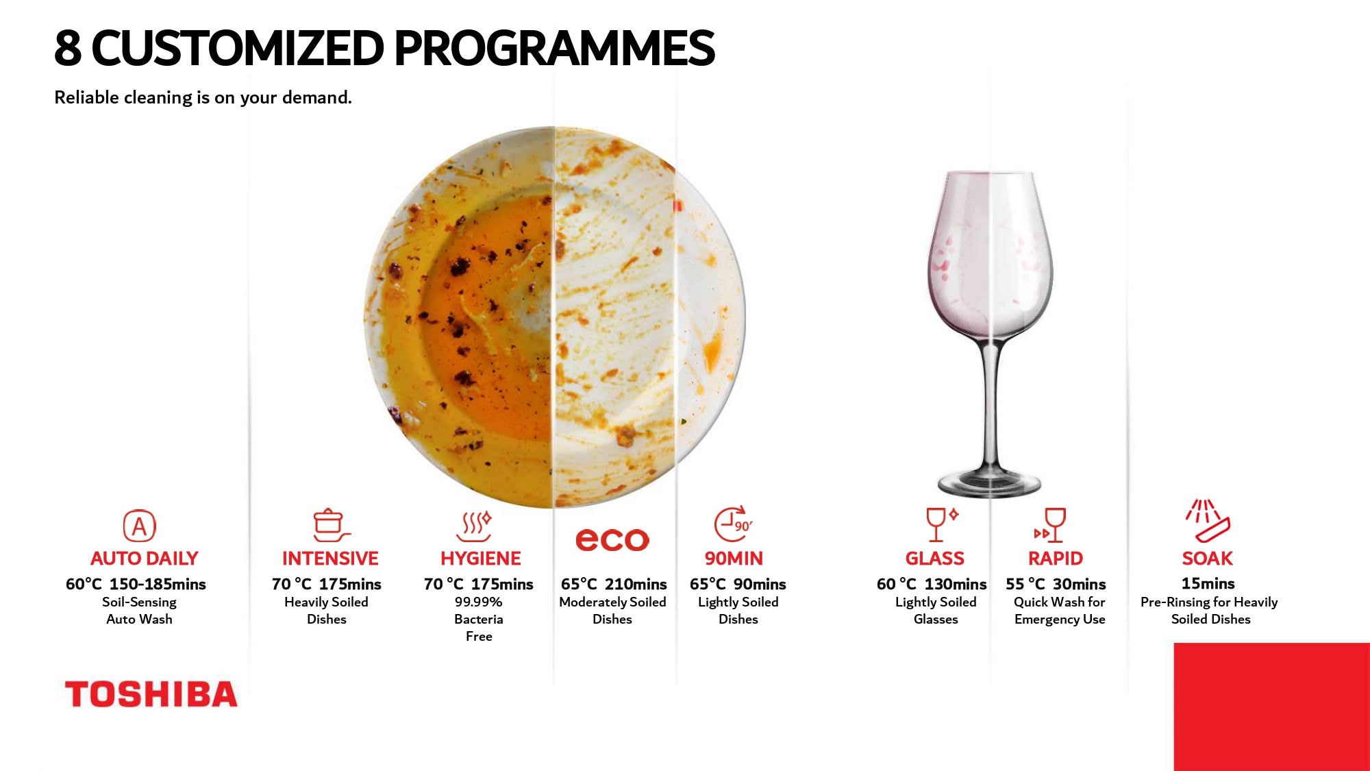 Washing Programs: 8 (Auto, Intensive, Hygiene, ECO, Glass, 90min, Rapid, Soak)